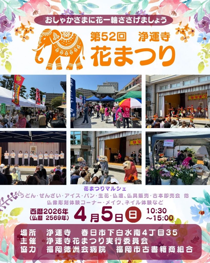 おしゃかさまに花一輪ささげましょう!世界中の仏教徒が心をこめてお祝いするお釈迦さまのお誕生日(4月8日)にあわせ、浄運寺では恒例の花まつりを開催致します。マルシェやアトラクションなど楽しい行事です。